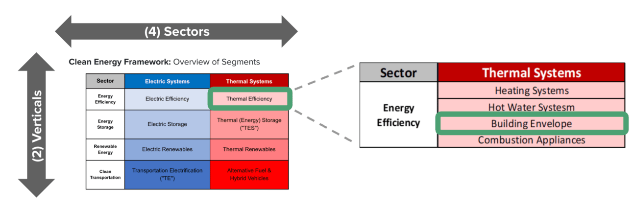 We’re exploring the Energy Efficiency sector, focusing on Building Envelope system within the Thermal Efficiency segment. Building envelopes — like walls, windows, and insulation — play a crucial role in reducing heat loss and stabilizing indoor temperatures. By improving these systems, buildings use less energy for heating and cooling, leading to greater energy efficiency and more comfortable, healthy indoor environments.