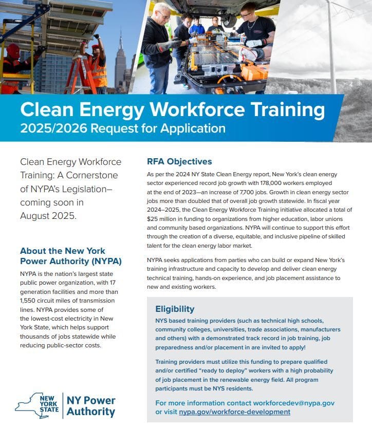 New York Power Authority (NYPA) had released an RFA seeking applications from NYS based training providers (such as technical high schools, community colleges, universities, trade associations, manufacturers, and others) who can collaborate to develop technical training opportunities, hands-on experience, paid internships and full-time jobs for people entering the clean energy workforce and advance training opportunities for traditional utility workers.