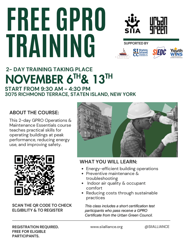 Our partners at the Staten Island Industrial Alliance are offering a free, two-day GPRO certification course tailored for building professionals who want to sharpen their expertise in sustainable operations. This training provides practical strategies to boost energy efficiency, cut operating costs, and improve overall building performance. With just fifteen seats open, we encourage you to spread the word and help connect interested participants to this valuable opportunity.