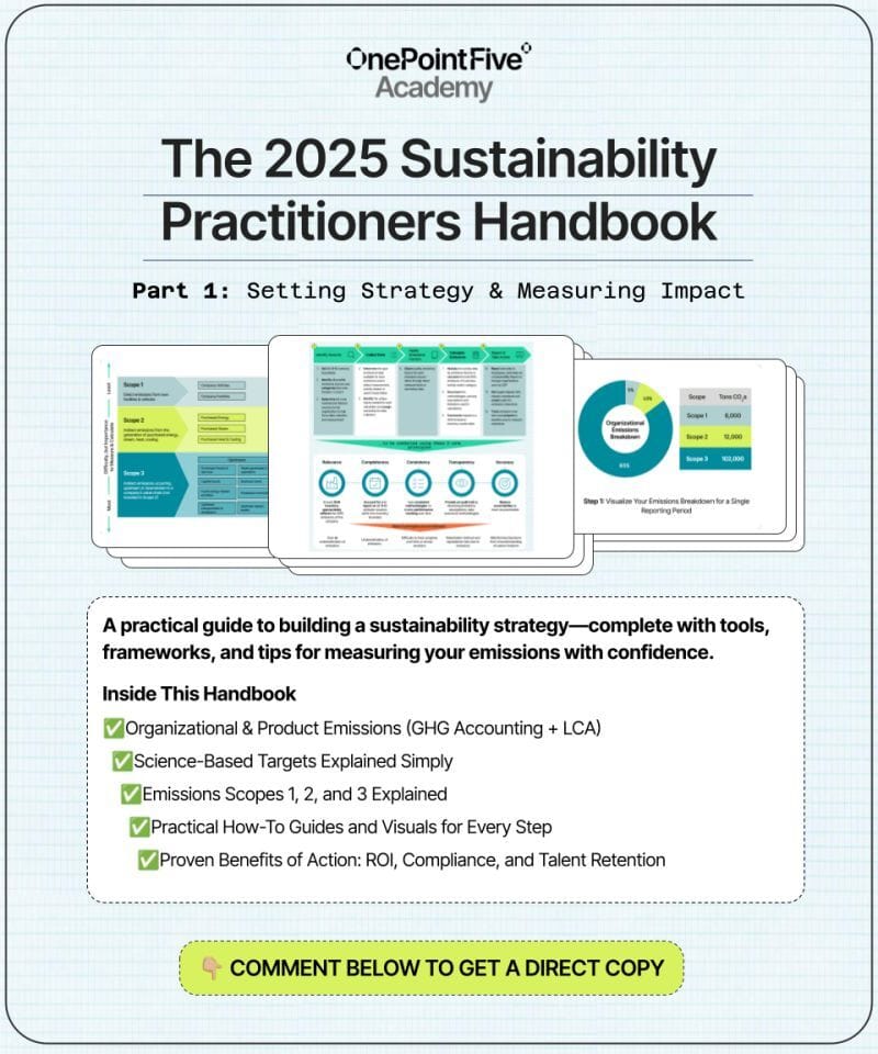 Part 1 and 2 of The 2025 Sustainability Practitioners Handbook offer clear, actionable guidance built from the OPF team’s work across 100+ net-zero projects. From navigating climate disclosures to aligning with IFRS standards and setting ambitious targets, this resource cuts through the noise to help practitioners stay ahead. Huge kudos to the OnePointFive team (opf.degree) for making this available to the field!