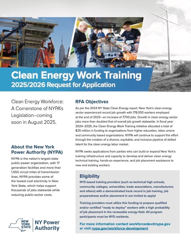 In August, New York Power Authority (NYPA) is releasing an RFA seeking applications from NYS based training providers (such as technical high schools, community colleges, universities, trade associations, manufacturers, and others) who can collaborate to develop technical training opportunities, hands-on experience, paid internships and full-time jobs for people entering the clean energy workforce and advance training opportunities for traditional utility workers.