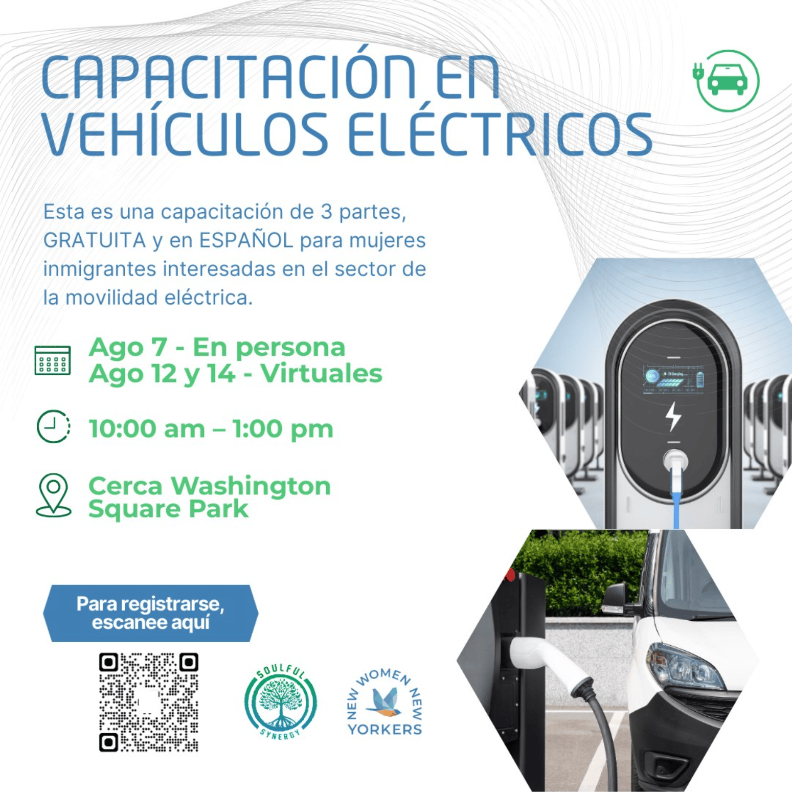 Our partners New Women New Yorkers and Soulful Synergy are teaming up to launch a free three-part Electric Vehicle Training in Spanish — designed specifically for immigrant women exploring careers in clean transportation. The series covers EV fundamentals, site evaluation, and managed charging, with sessions running in Early August.