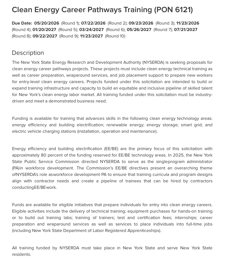 Clean Energy Career Pathways Training Program (PON 6121) has $30 million in funding available to support workforce development across New York State..